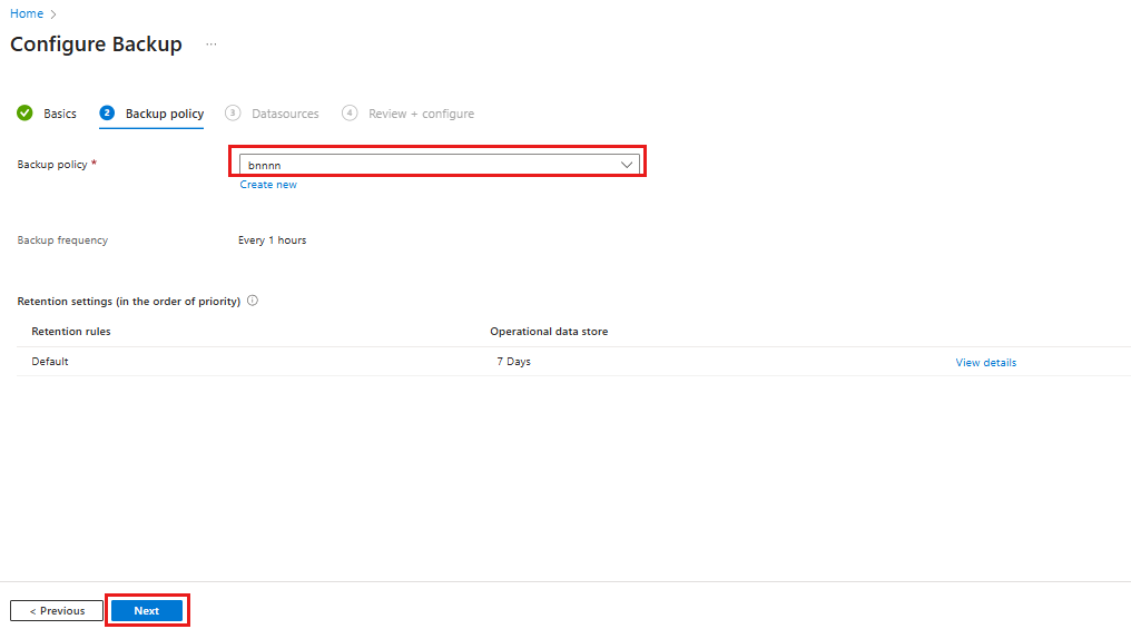 On the Backup policy tab, choose a Backup policy, and then select Next.