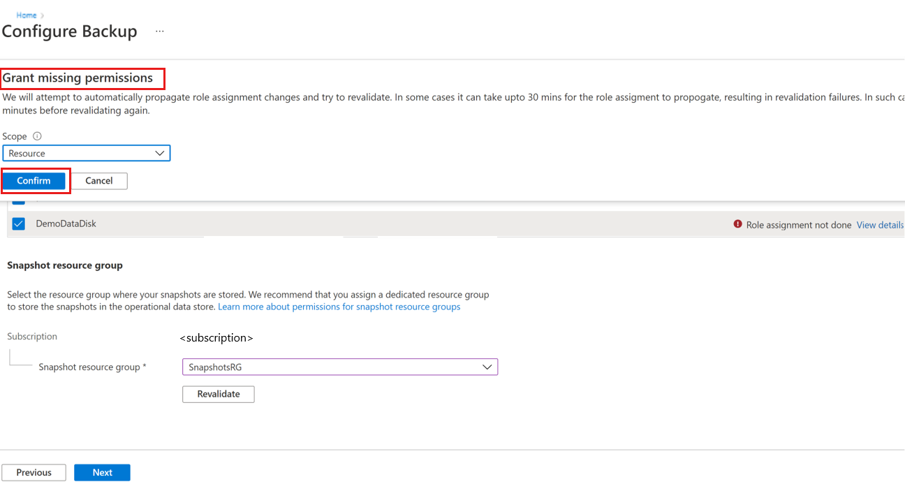 If you plan to configure backup for other disks in the same resource group/subscription in future, you can choose to provide permission at the scope of resource group or subscription.
