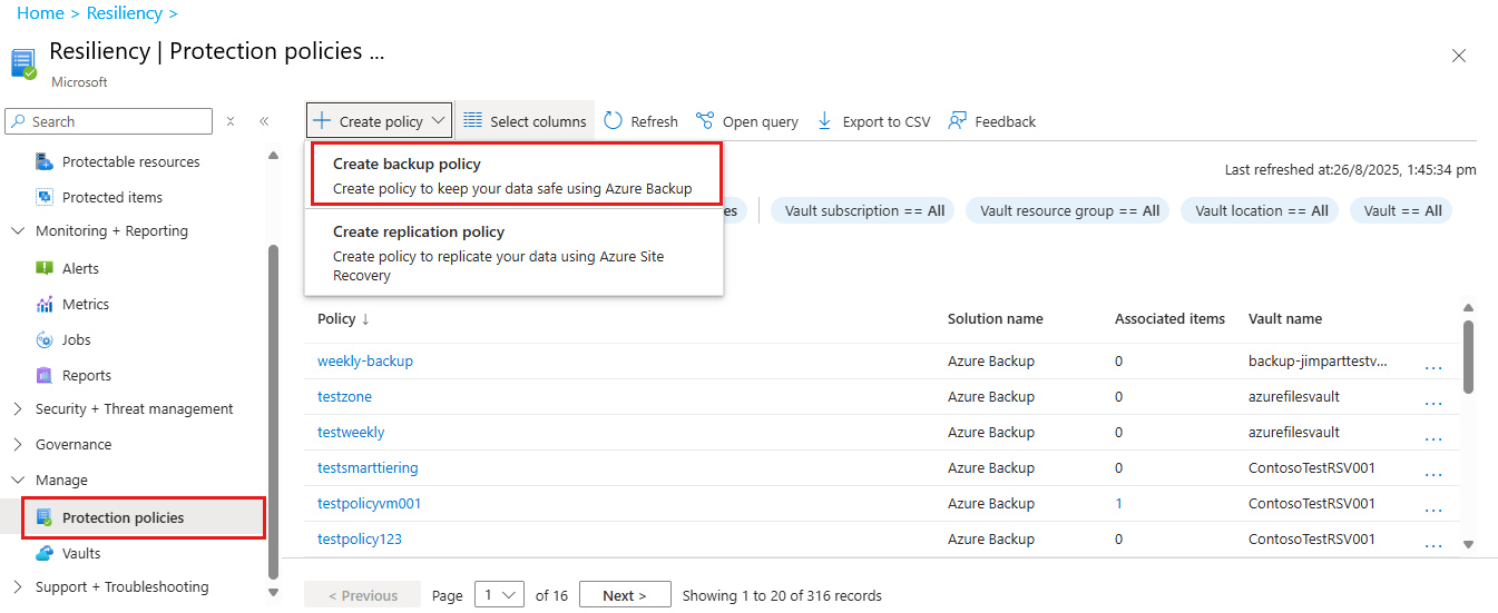 On the Protection policies pane, select + Create policy > Create backup policy.