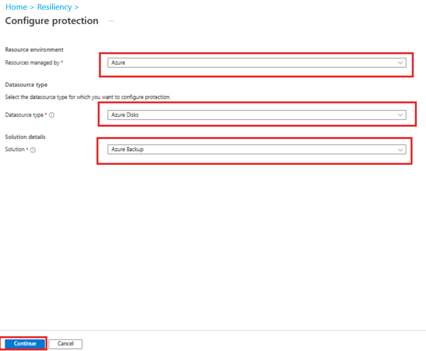 On the Configure protection pane, select Resource managed by as Azure, Datasource type as Azure Disks, Solution as Azure Backup, and then select Continue.
