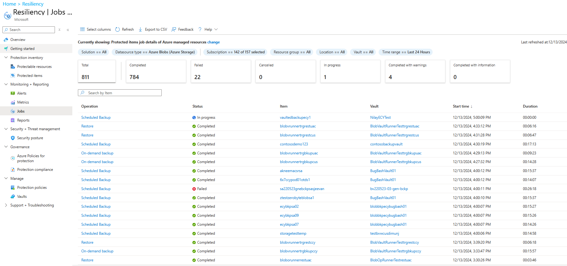 Track restore: Use the Backup Jobs view to track the details and status of restores. To do this, go to Resiliency > Jobs. The status will show In progress while the restore is being performed.