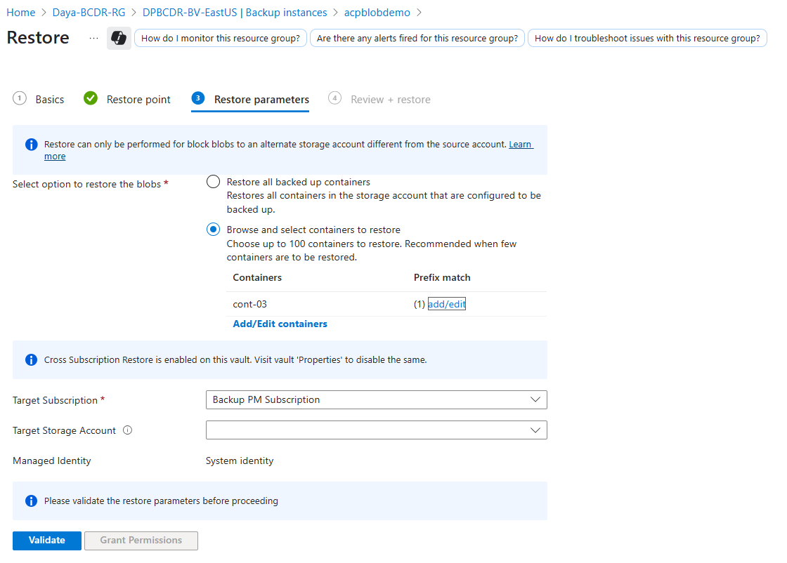 The vault must have the Storage account backup contributor role assigned on the target storage account. Select Validate to ensure that the required permissions to perform the restore are assigned. Once done, proceed to the next tab.