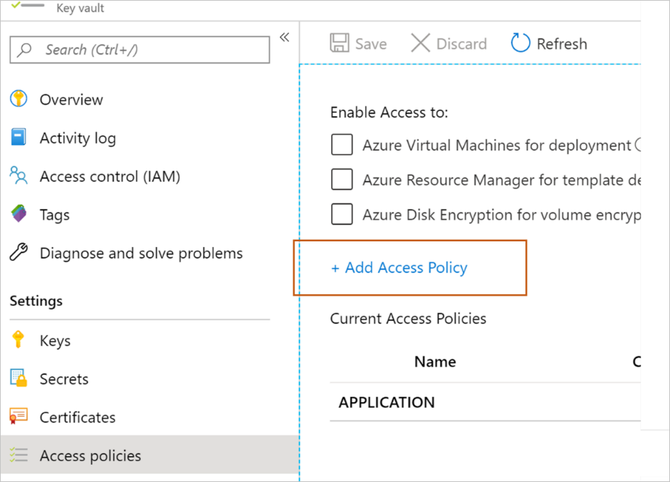 Go to your key vault > Access policies. Select +Add Access Policy.