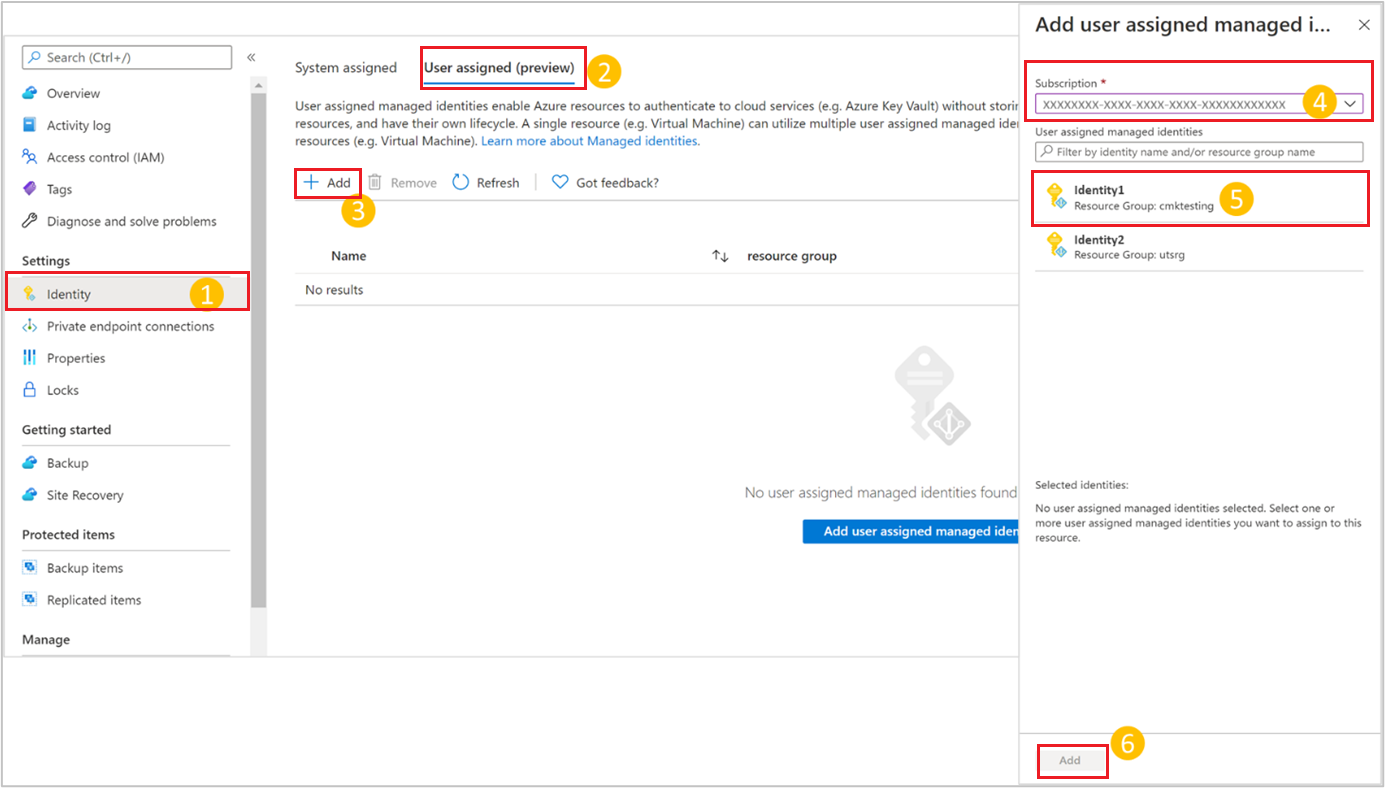 For Identity, specify the user-assigned managed identity to manage encryption by using CMKs. Choose Select to browse to and select the required identity.