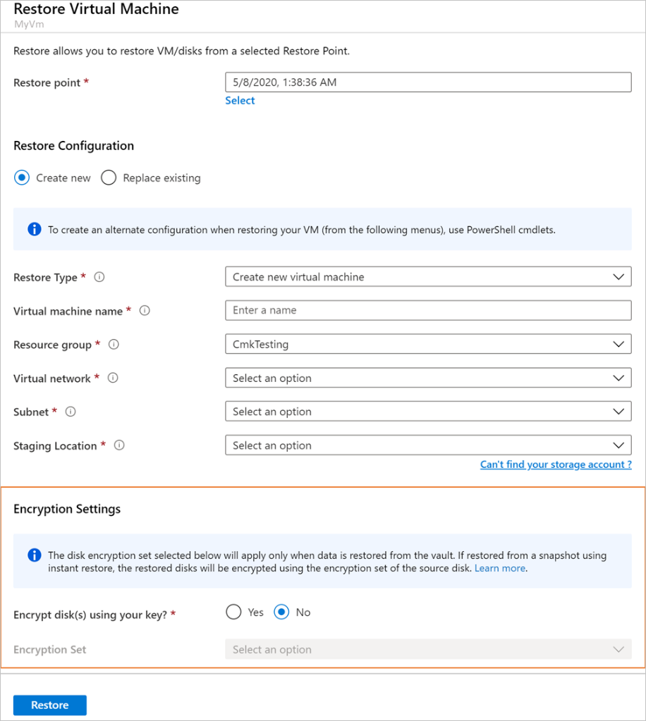 The experience that this section describes applies only when you restore data from CMK-encrypted vaults. When you restore data from a vault that isn't using CMK encryption, the restored data is encrypted via PMKs. If you restore from an instant recovery snapshot, the restored data is encrypted via the mechanism that you used for encrypting the source disk.