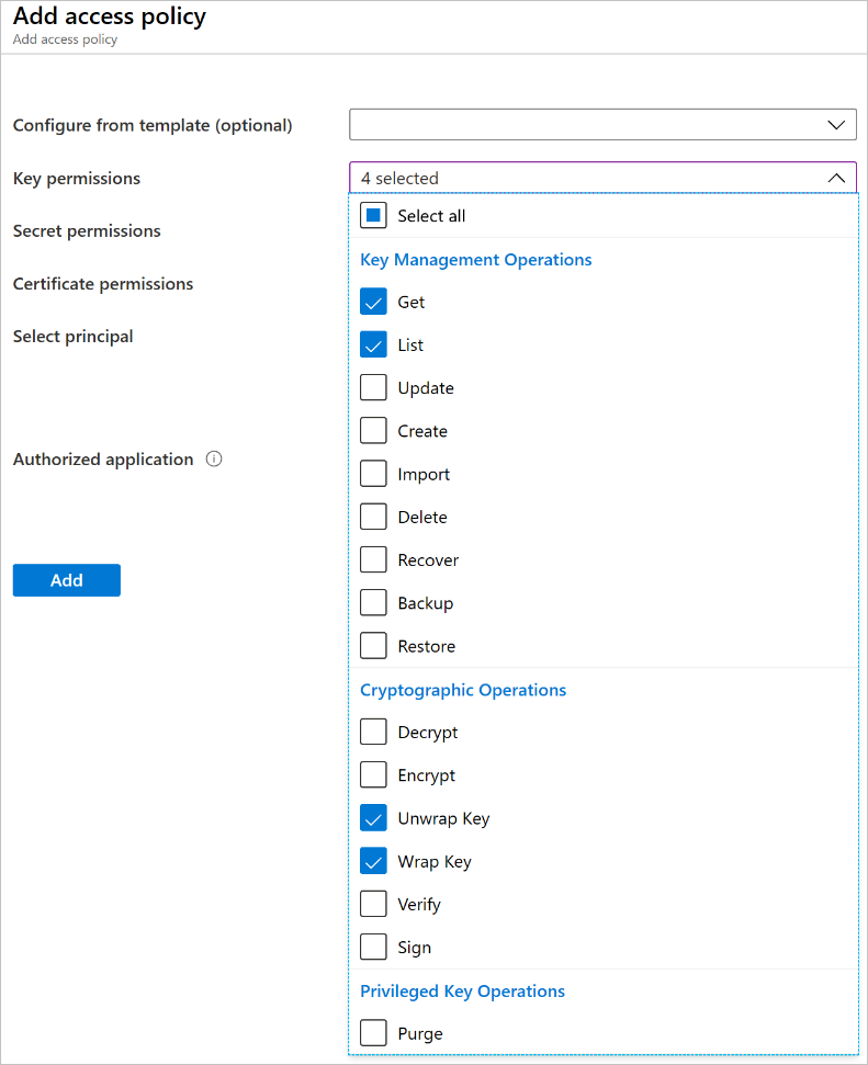 Specify the actions to permit on the key. For Key permissions, select the Get, List, Unwrap Key, and Wrap Key operations.