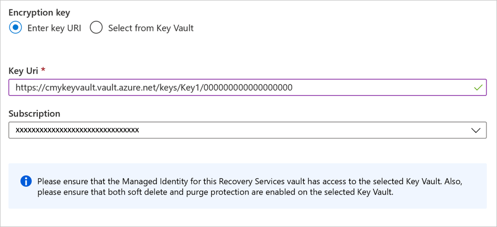 Select Enter key URI. In the Key Uri box, enter the URI for the key that you want to use for encrypting data in this Recovery Services vault. You can also get this key URI from the corresponding key in your key vault. In the Subscription box, specify the subscription for the key vault that contains this key.