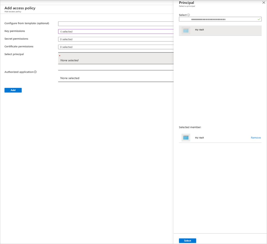 Go to Select principal and search for your vault in the search box by using its name or managed identity. When the vault appears, select it and then choose Select at the bottom of the panel.