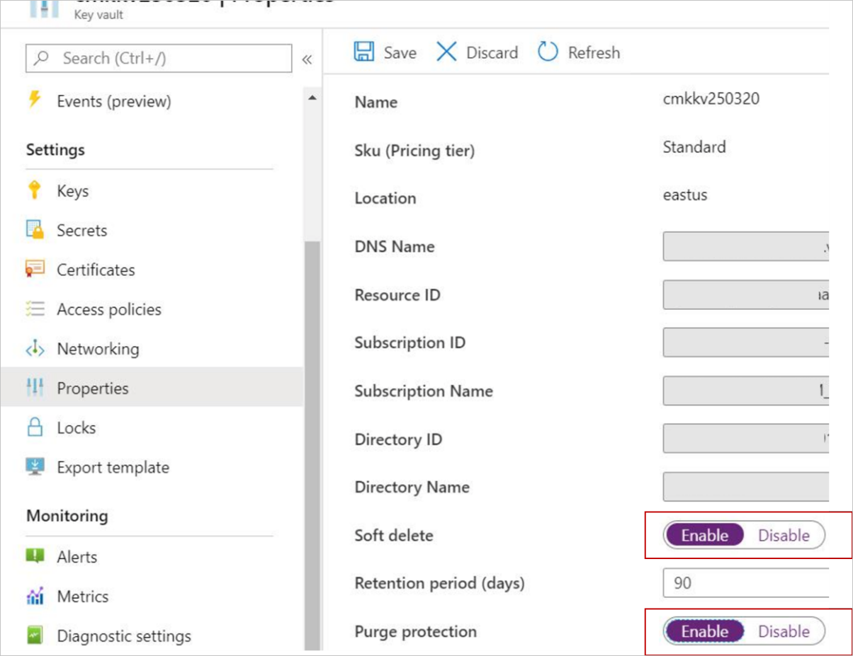 You can enable soft delete and purge protection from the Azure Key Vault interface, as shown in the following screenshot. Alternatively, you can set these properties while creating the key vault. Learn more about these Key Vault properties.