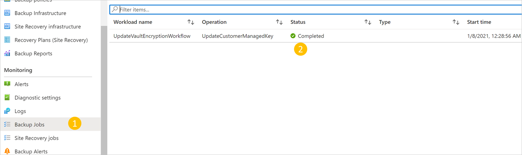 Track the progress and status of the encryption key assignment by using the Backup Jobs view on the left menu. The status should soon change to Completed. Your vault will now encrypt all the data with the specified key as a KEK.