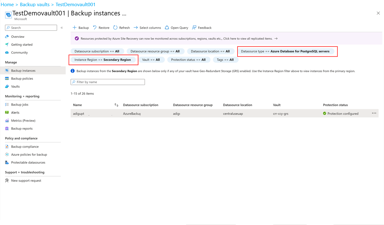To check the availability of recovery point in the secondary region, go to the Backup vault > Backup Instances > Filter to Azure Database for PostgreSQL servers, filter Instance Region as Secondary Region, and then select the required Backup Instance.