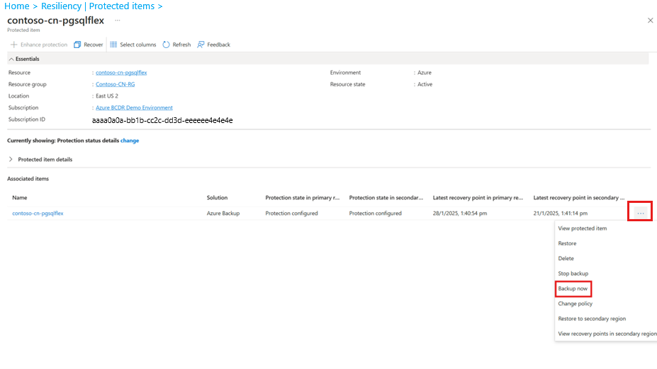Select the protected item to run an on-demand backup.