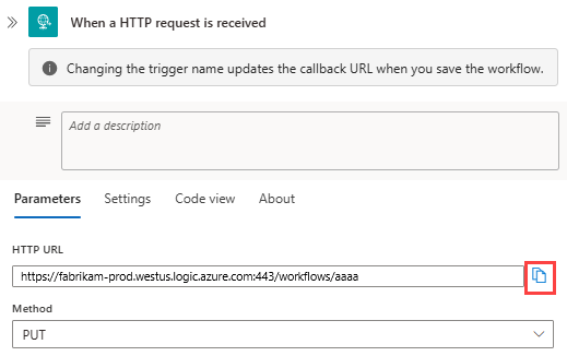 Property name JSON property name Required Description HTTP URL {none} Yes The endpoint URL that's generated after you save your workflow and is used for sending a request that triggers your workflow. Request Body JSON Schema schemaNo The JSON schema that describes the properties and values in the incoming request body. The designer uses this schema to generate tokens for the properties in the request. That way, your workflow can parse, consume, and pass along outputs from the Request trigger into your workflow.