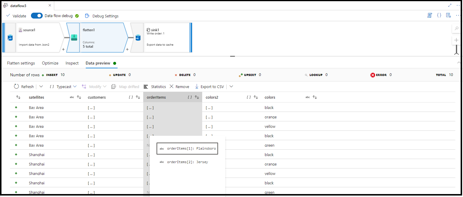 Use the flatten transformation to take array values inside hierarchical structures such as JSON and unroll them into individual rows. This process is known as denormalization.