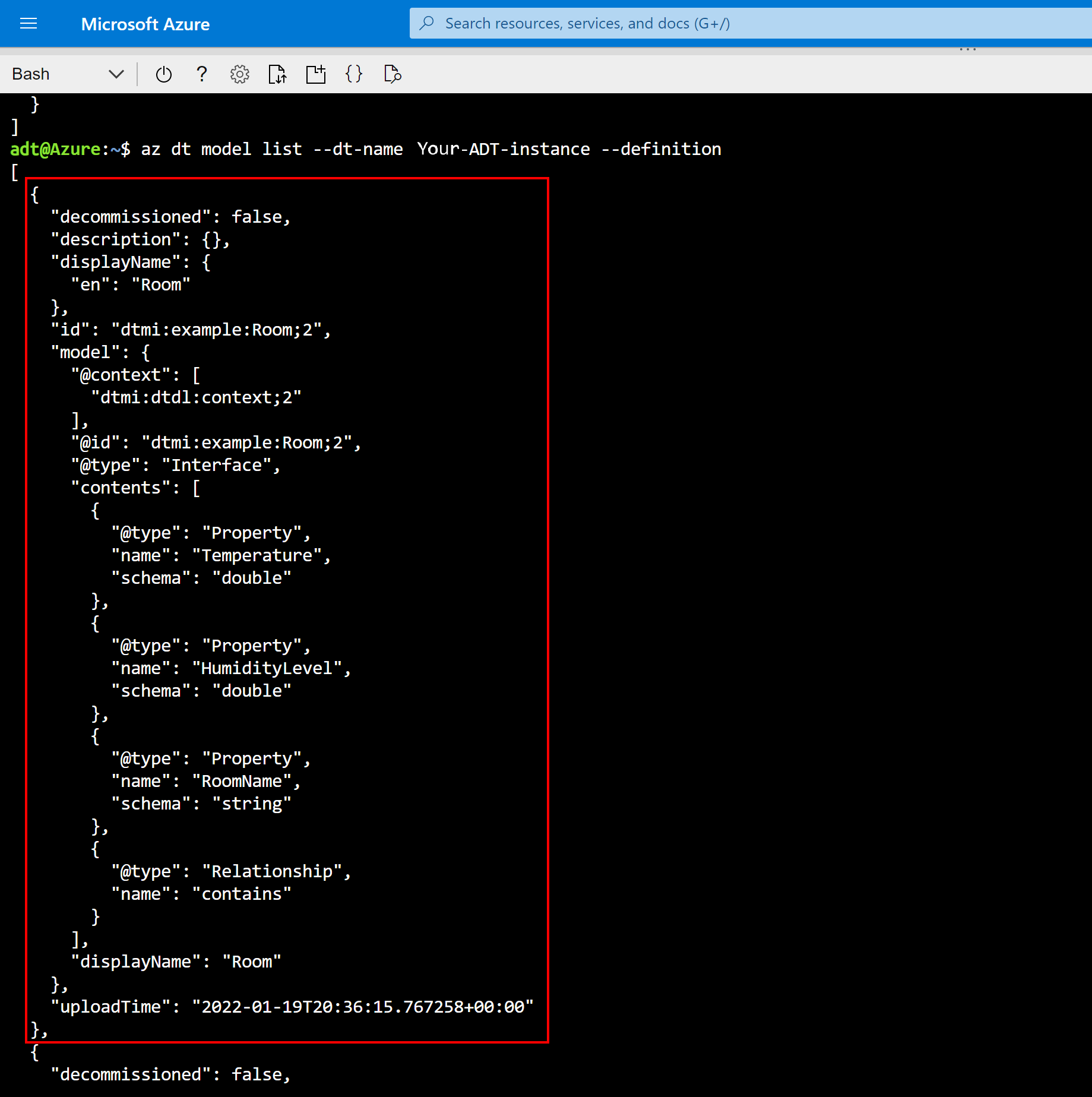 az dt model list --dt-name <Azure-Digital-Twins-instance-hostname-or-name> --definitionLook for the edited Room model in the results: