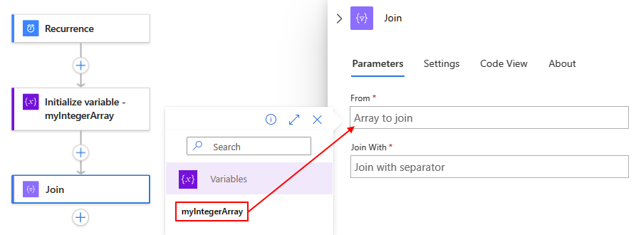 To create a string that has all the items from an array and separate those items with a specific delimiter character, use the Join action. You can then use the string in actions that follow the Join action.