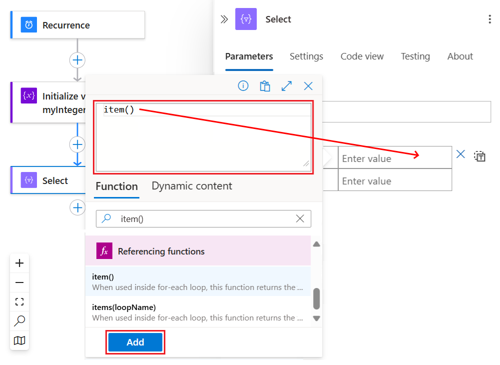 In the expression editor, enter the function named item(), and then select Add.