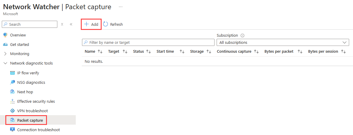 Select Packet capture under Network diagnostic tools, then select + Add to create a packet capture.