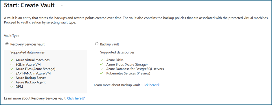 A Recovery Services vault is a management entity that stores recovery points that are created over time, and it provides an interface to perform backup-related and replication related operations. For certain newer workloads, Azure Backup also uses Backup vault to store recovery points and interface for operations. Learn about on the guidelines when creating a vault.