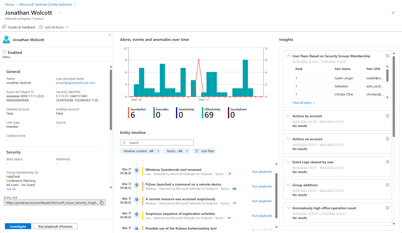 Entity insights are queries defined by Microsoft security researchers to help your analysts investigate more efficiently and effectively. The insights are presented as part of the entity page, and provide valuable security information on hosts and users, in the form of tabular data and charts. Having the information here means you don't have to detour to Log Analytics. The insights include data regarding sign-ins, group additions, anomalous events and more, and include advanced ML algorithms to detect anomalous behavior.
