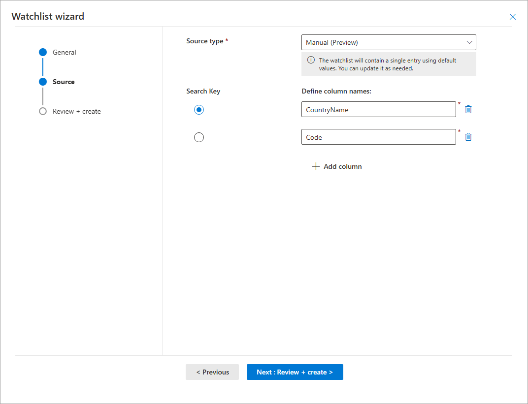 On the Source page, use the information in the following table to upload your watchlist data, and then select Next: Review + create.