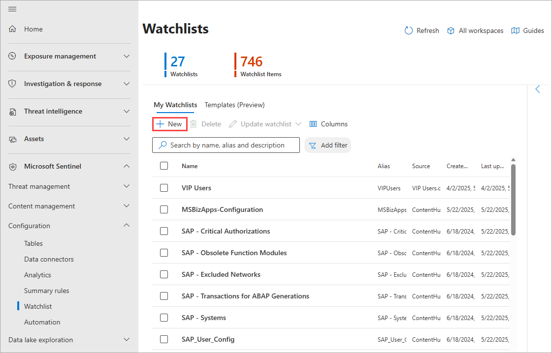 In the Defender portal, go to Microsoft Sentinel > Configuration > Watchlist.