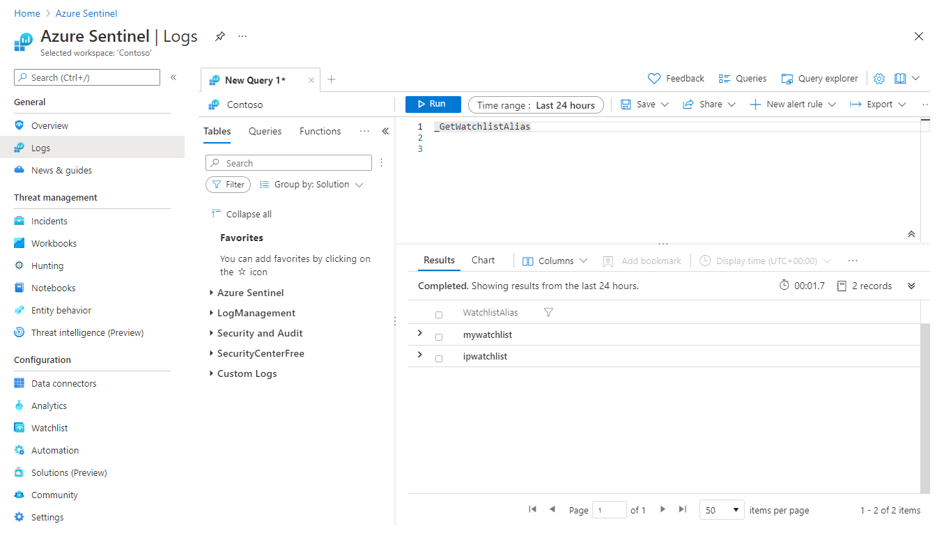 //Watchlist as a variable let watchlist = (_GetWatchlist('ipwatchlist') | project IPAddress); Heartbeat | where ComputerIP in (watchlist)The following example query uses the watchlist inline with the query and the search key defined for the watchlist.