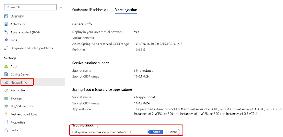 Select the Azure Spring Apps service instance deployed in your virtual network and then select Networking in the navigation menu.