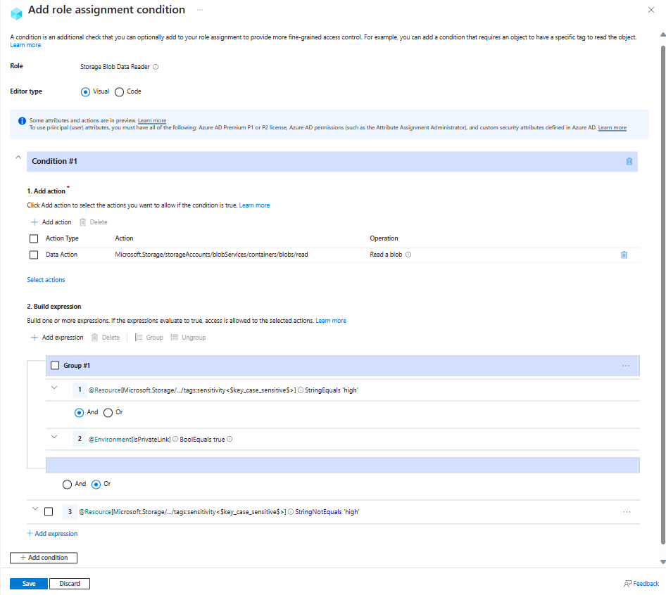 Group Setting Value Group #1 Attribute source Resource Attribute Blob index tags [Values in key] Key sensitivityOperator StringEquals Value highLogical operator 'AND' Attribute source Environment Attribute Is private link Operator BoolEquals Value TrueEnd of Group #1 Logical operator 'OR' Attribute source Resource Attribute Blob index tags [Values in key] Key sensitivityOperator StringNotEquals Value high