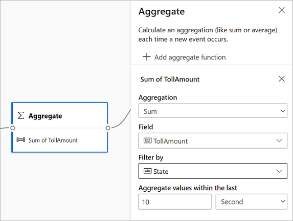 To add an aggregation, select the transformation symbol. Then connect an input, select the aggregation, add any filter or slice dimensions, and select the period of time over which the aggregation will be calculated. In this example, we're calculating the sum of the toll value by the state where the vehicle is from over the last 10 seconds.