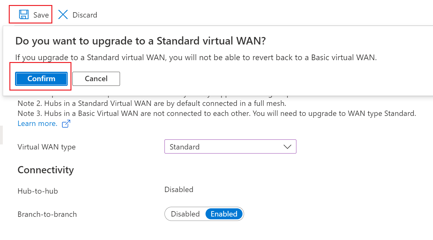 Understand that if you upgrade to a Standard virtual WAN, you can't revert back to a Basic virtual WAN. Select Confirm if you want to upgrade. Then, click Save.