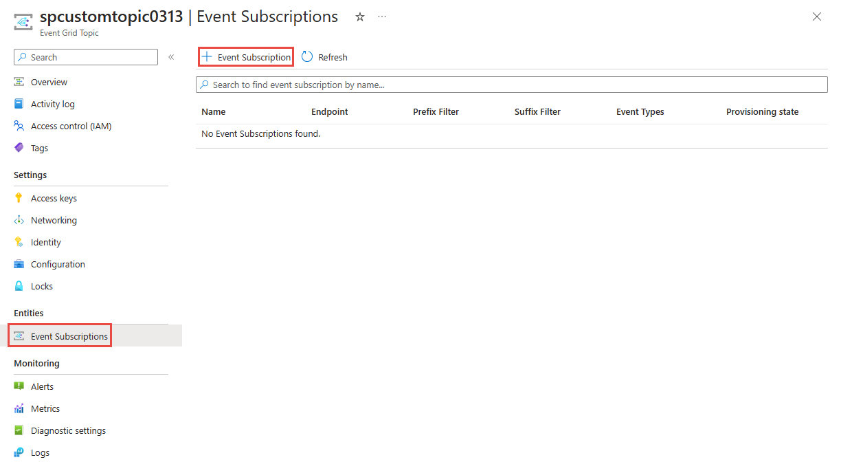 5. On the Event Subscriptions page, you should see the subscription you created.