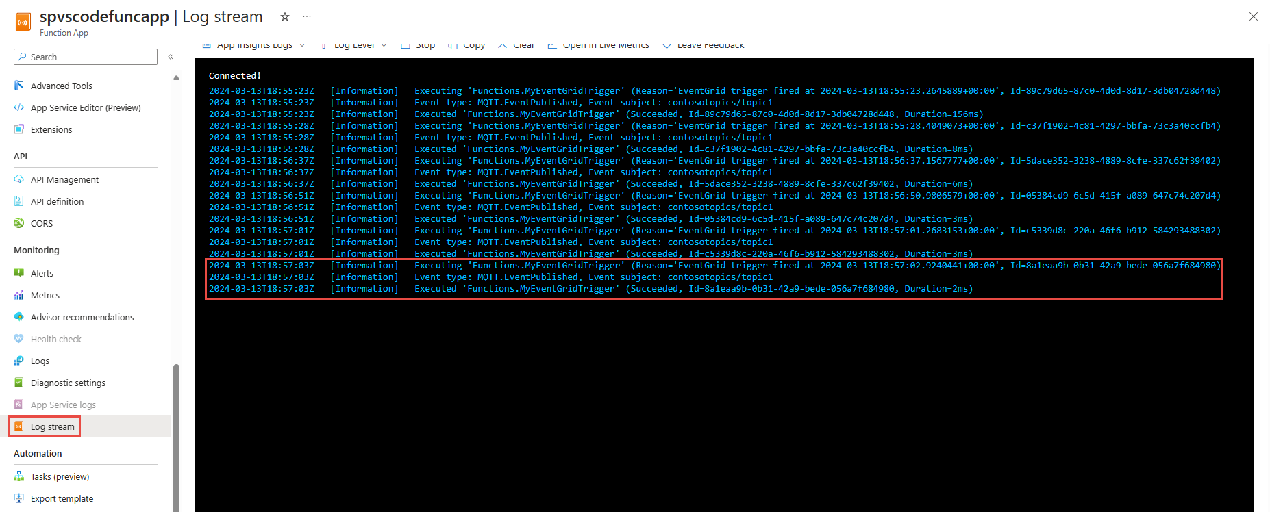 Send test MQTT messages to the namespace and confirm that the function receives them.