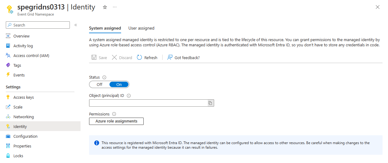 1. On the Event Grid Namespace page, select Identity. Select On and then Save.