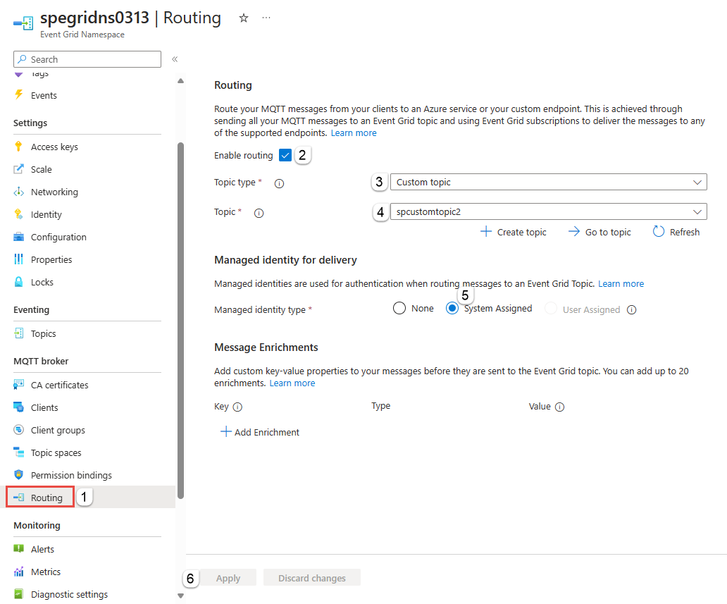 In this section, configure routing for the Event Grid namespace so that the messages it receives are routed to the custom topic you created.