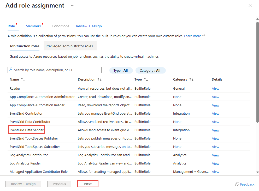 5. On the Role page of the Add role assignment wizard, select Event Grid Data Sender role, and select Next.