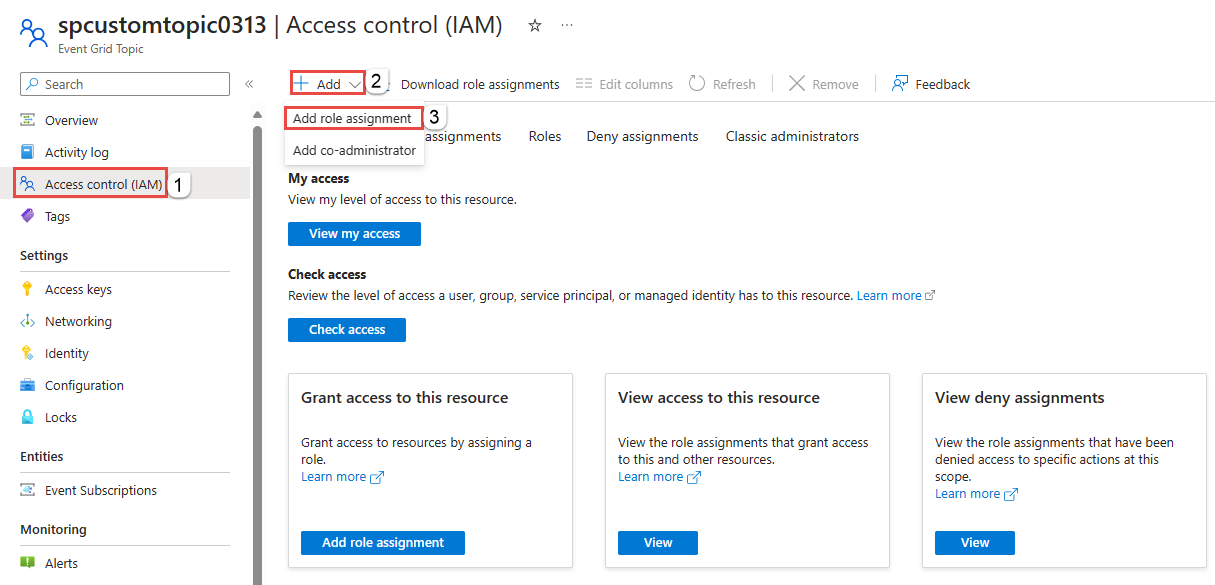 In this section, you enable system-assigned managed identity for the Event Grid namespace. Then, grant the identity the send permission to the Event Grid custom topic. It can then route message to the custom topic. You enable it by adding the managed identity to the Event Grid Data Sender role on the custom topic.