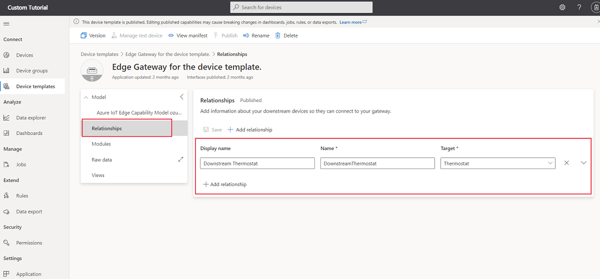The following screenshot shows the Relationships page for an IoT Edge gateway device with downstream devices that use the Thermostat device template:
