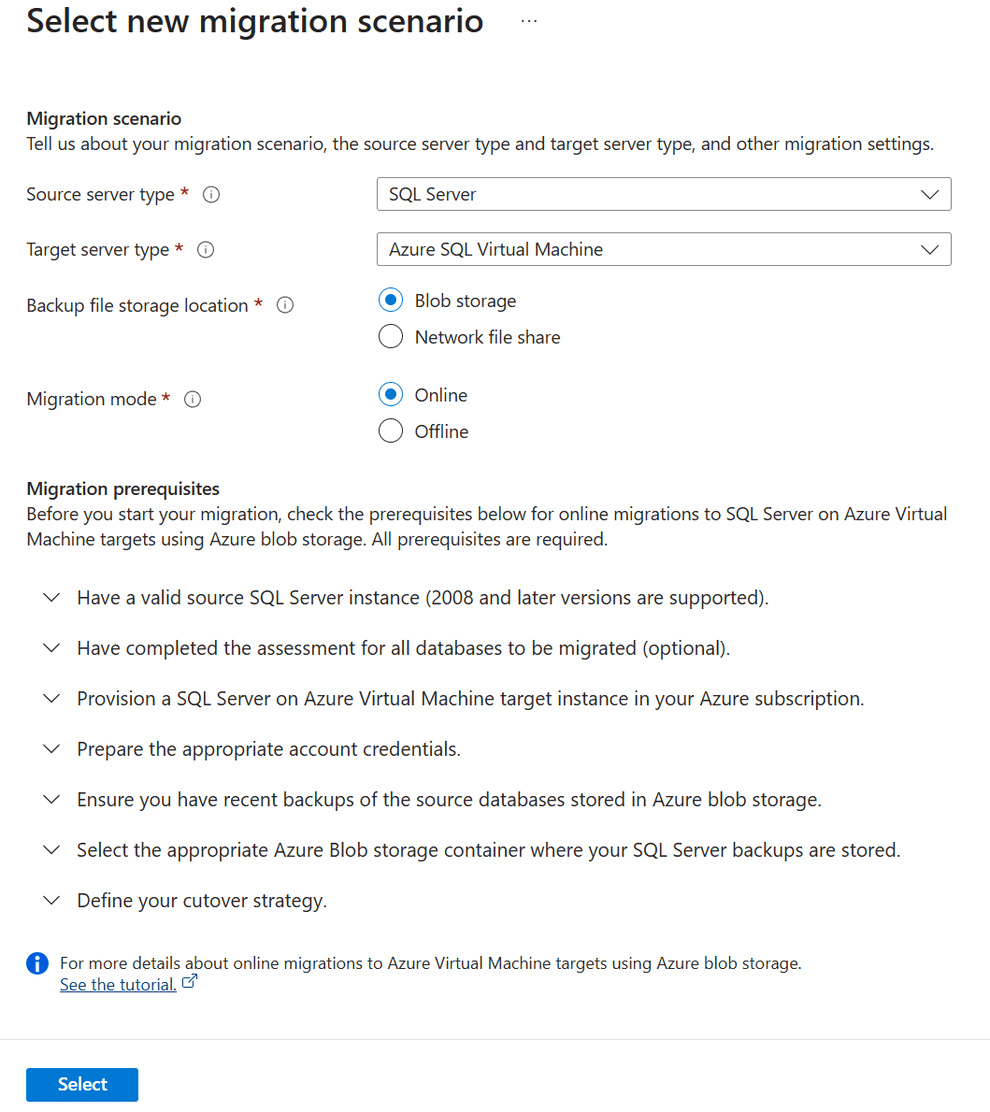 Under Select new migration scenario, choose your source, target server type, backup file storage location, migration mode as Online migration, and choose Select.