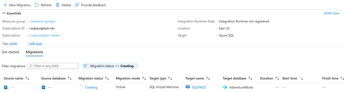 Under the Migrations tab, you can track migrations that are in progress, completed, and failed (if any), or you can view all database migrations. In the menu bar, select Refresh to update the migration status.
