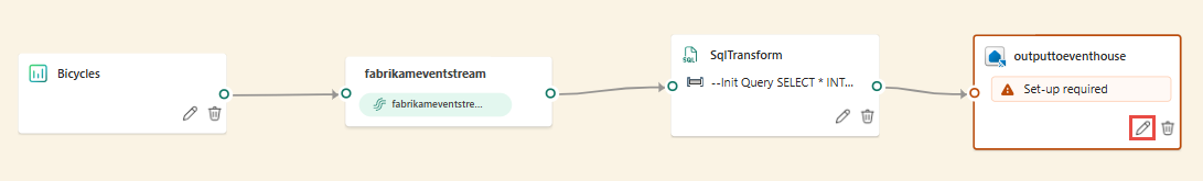A new SQL node is added to your eventstream. Select the pencil icon to continue setting up the SQL operator.