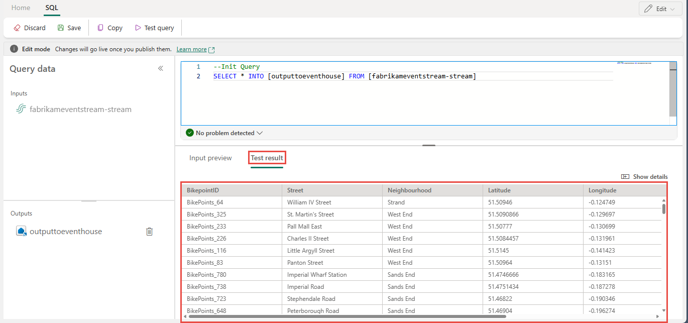 CASEstatement to categorize temperature:SELECT deviceId, temperature, CASE WHEN temperature > 85 THEN 'High' WHEN temperature BETWEEN 60 AND 85 THEN 'Normal' ELSE 'Low' END AS TempCategory INTO CategorizedTempOutput FROM SensorInputOn the ribbon, use the Test query command to validate the transformation logic. Test query results appear on the Test result tab.