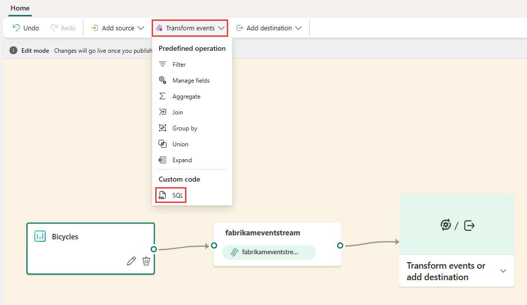 To perform stream processing operations on your data streams by using a SQL operator, add a SQL operator to your eventstream by using the following instructions: