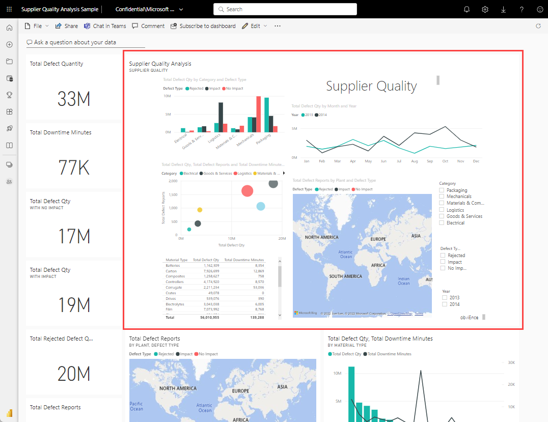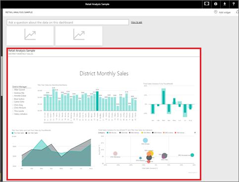 Another way to add a new dashboard tile is by pinning an entire report page. This method allows you to pin more than one visualization at a time. Also, when you pin an entire page, the tiles are live; you can interact with them right there on the dashboard. Changes you make to any of the visualizations back in the report editor, like adding a filter or changing the fields used in the chart, are reflected in the dashboard tile as well.