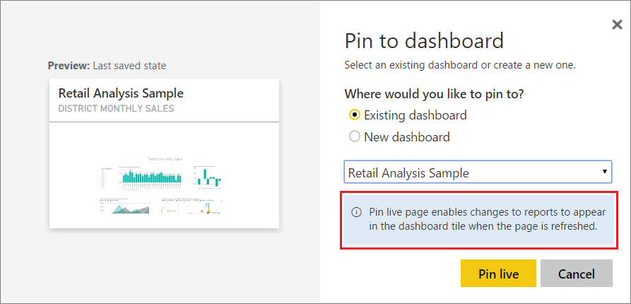 Pin the tile to an existing dashboard or to a new dashboard. Notice the highlighted text: Pin live page enables changes to reports to appear in the dashboard tile when the page is refreshed.