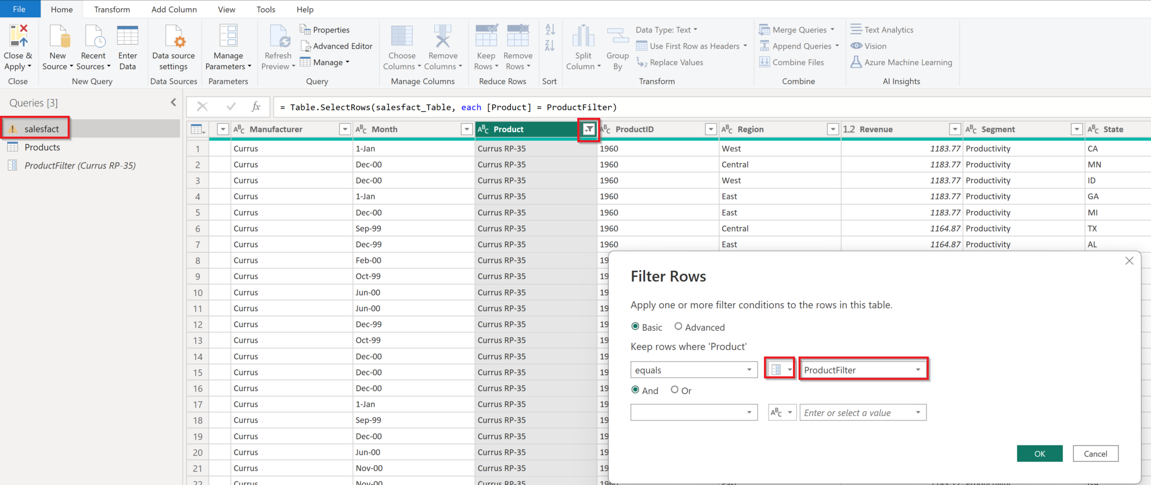 Select the dropdown icon of the Partition Key column, then select Text Filters > Equals. Change the filter type from Text to Parameter. Then choose the parameter that was created in step b. Select Close & Apply on top left corner of the Power Query editor.