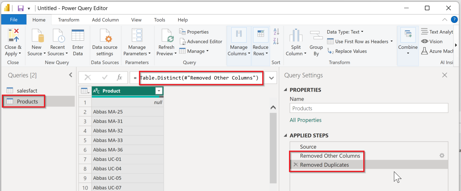Rename the new Partition Key model, then right-click on the Cosmos DB partition key column. In this example, Product is the Cosmos DB partition key column. Select Remove Other Columns, and then select Remove Duplicates.