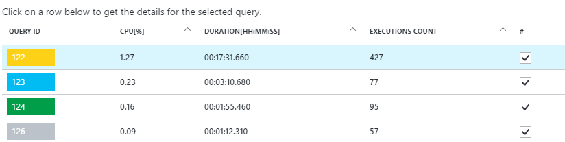 • El gráfico superior muestra una línea con el porcentaje general de DTU de base de datos. Las barras son el porcentaje de CPU que consume la consulta seleccionada.