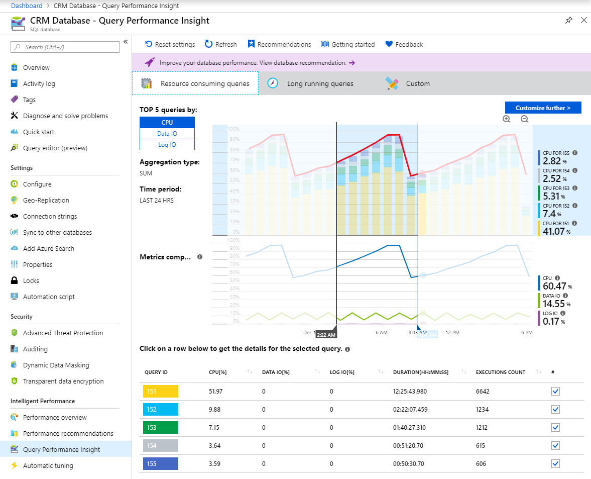 Se recomienda usar el gráfico de DTU personalizado para compararlo con el gráfico de rendimiento de consultas.