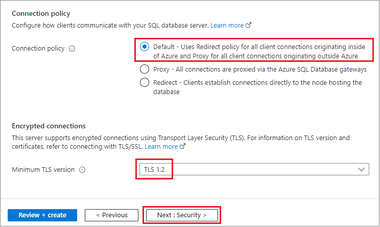 En Directiva de conexión, elija la Directiva de conexiónpredeterminada y deje Versión mínima de TLS en el valor predeterminado de TLS 1.2.